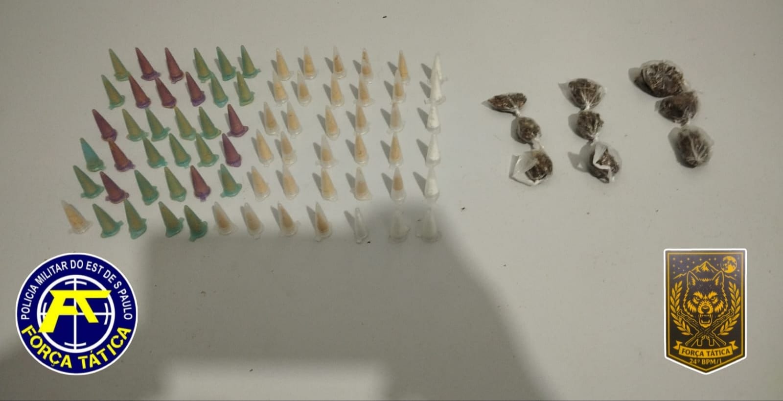​Apesar da tentativa de fuga, os policiais conseguiram abordar um indivíduo identificado. Durante a revista pessoal, a equipe localizou: ​72 eppendorfs (pinos) de cocaína; 09 porções de maconha e ​01 aparelho celular.
