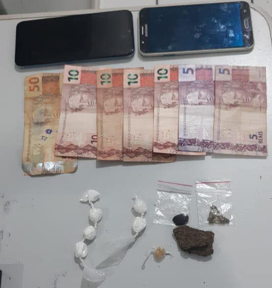 O homem preso em flagrante estava com maconha, haxixe, dinheiro e um celular. Já o adolescente foi flagrado com porções de cocaína e crack, além de outro celular.