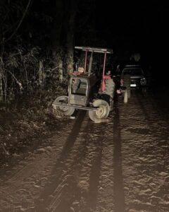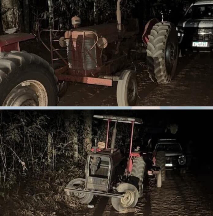 Com apoio de várias viaturas, os policiais realizaram patrulhamento e avistaram dois tratores. Na tentativa de abordagem, um dos condutores não obedeceu à ordem de parada e atropelou um Policial Militar, que sofreu fraturas e escoriações.