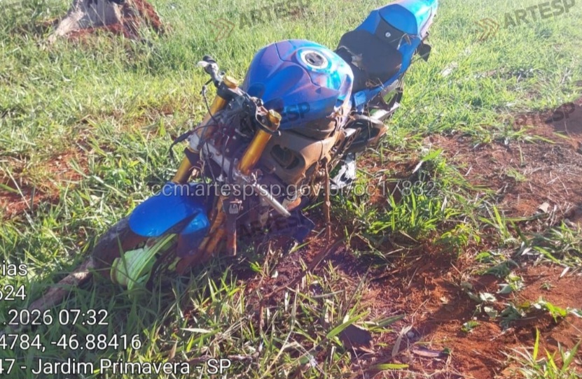 O motociclista perdeu o controle, atravessou o canteiro central e colidiu contra a cerca de uma propriedade particular; as causas ainda são desconhecidas.