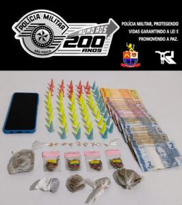 ​Após a abordagem e busca pessoal, os policiais localizaram no interior da pochete uma diversidade de drogas prontas para a venda e dinheiro em espécie: 58 pinos de cocaína (0,070 kg); ​09 porções de maconha (0,045 kg); 09 pedras de crack (0,001 kg); R$ 212,00 em notas diversas e 01 aparelho celular.