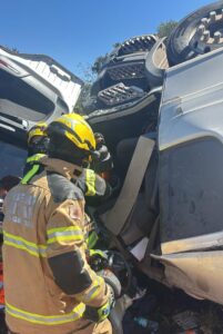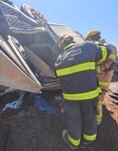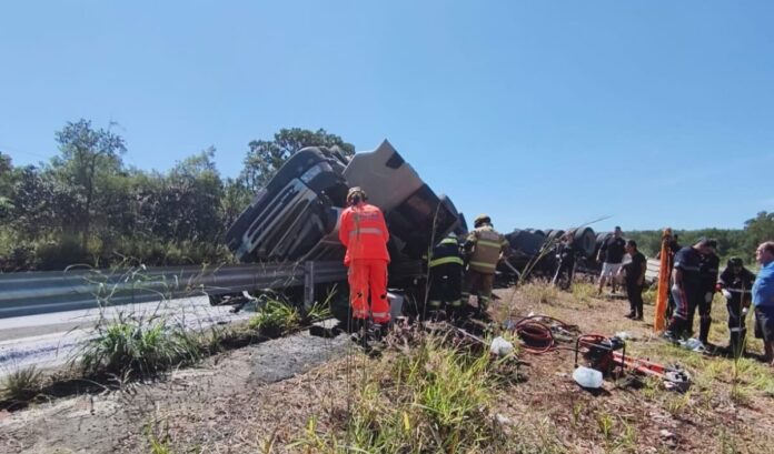 Por volta das 11h, as guarnições foram acionadas via Sala de Operações. Ao chegarem ao local, os militares encontraram um cenário crítico: a carreta estava tombada com a cabine voltada para baixo, apoiada sobre o parapeito de proteção da rodovia (guard rail), o que dificultava o acesso à vítima.
