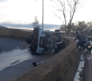 Na manhã desta sexta-feira, por volta das 6h, um caminhão carregado com melancias colidiu com uma mureta de contenção na estrada do Campestrinho, em Poços de Caldas. O acidente mobilizou equipes do Corpo de Bombeiros e do SAMU para o local.