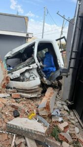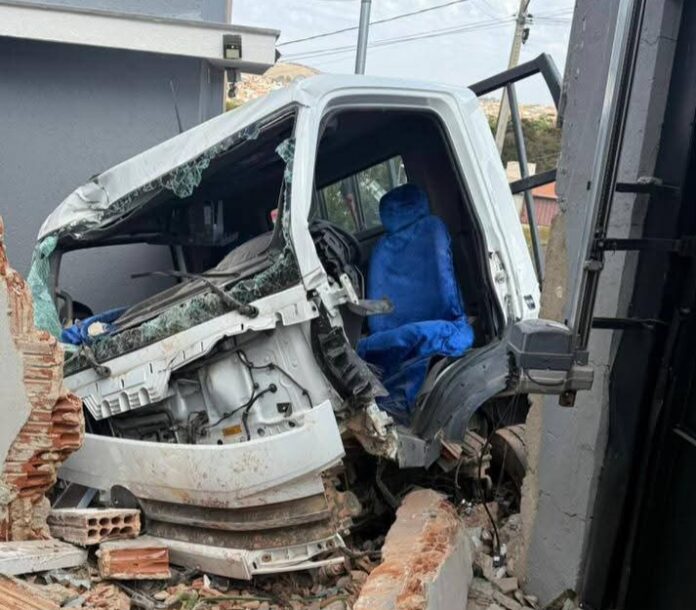 Por volta das 10h, um caminhão desgovernado colidiu com um carro de aplicativo e duas casas no bairro Parque dos Ipês.