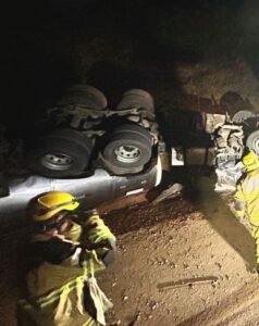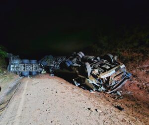 Após o forte impacto, o bitrem capotou, ficando completamente tombado e bloqueando os dois sentidos da rodovia, o que exigiu a intervenção da Polícia Militar para controle e sinalização do trânsito.