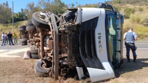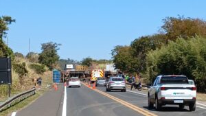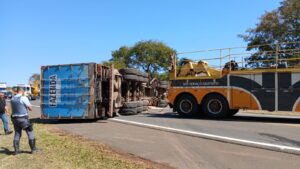 Apesar do susto, o motorista não se feriu e passa bem. A empresa responsável pelo transporte já está no local para fazer o transbordo da carga para outro veículo, possibilitando a liberação da pista, que ficou totalmente interditada nos dois sentidos .