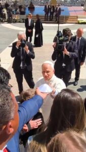 O Casal, teve acesso ao Papa e lhe presenteou com um solidéu, (cobertura branca da cabeça) representando o carinho de toda sua família para com o sumo Pontífice.