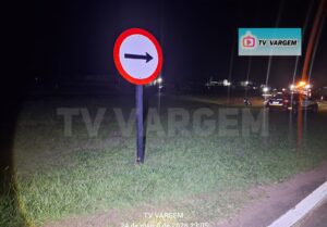Desgovernado, o veículo colidiu contra uma placa de sinalização às margens da rodovia e acabou tombando no canteiro central da rotatória.