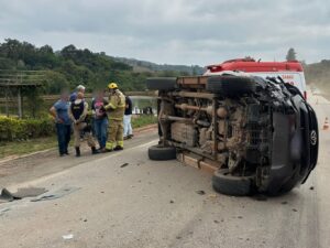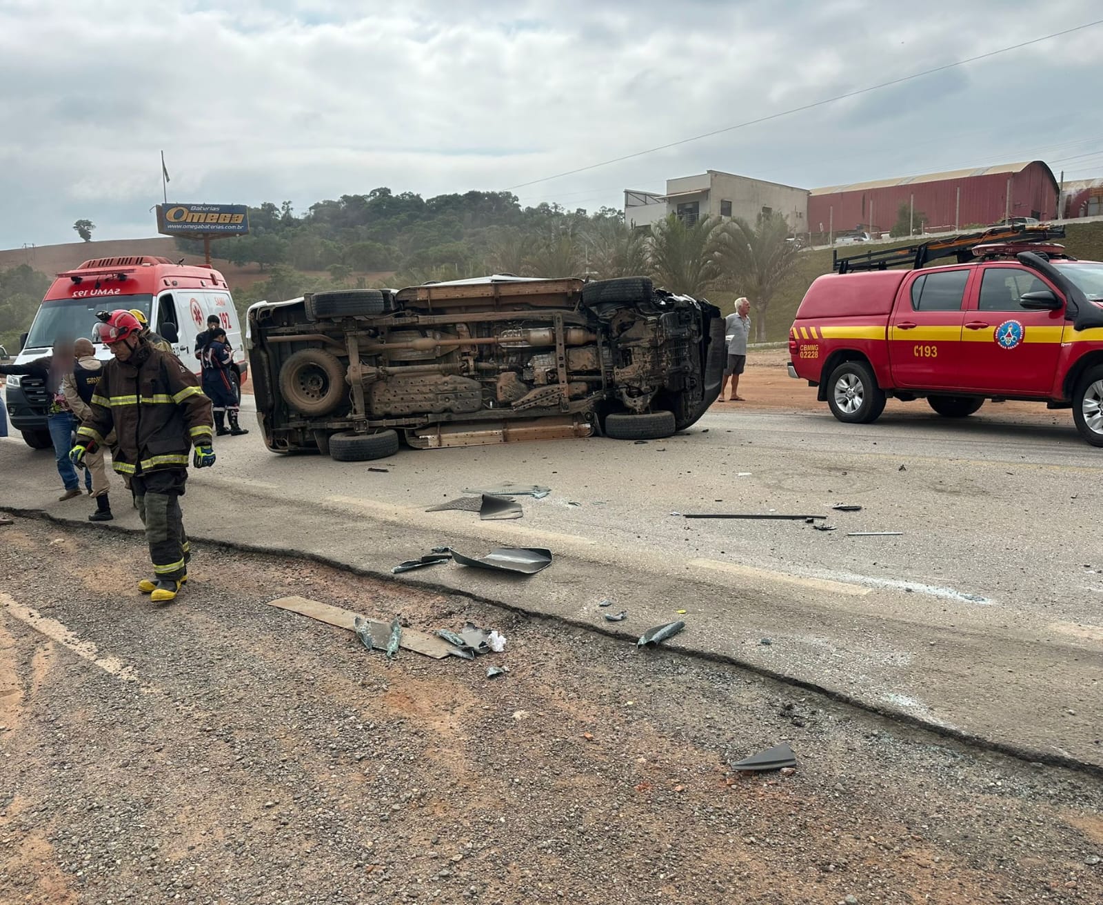 Acidente frontal-lateral na manhã desta quinta-feira envolveu uma caminhonete que capotou e um HB20 que foi lançado para fora da pista