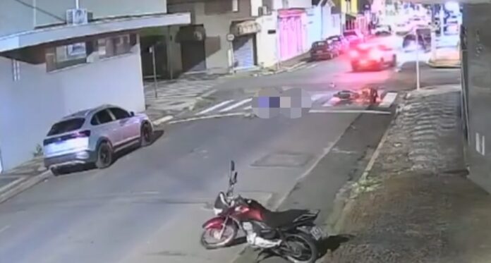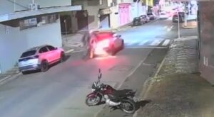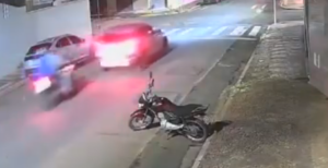 Câmeras de monitoramento de um estabelecimento comercial próximo ao local registraram o exato momento da colisão. Nas imagens, é possível ver quando a motocicleta, ocupada por dois indivíduos, atinge violentamente a traseira de um automóvel. O impacto lançou os ocupantes contra o solo, causando ferimentos graves de forma imediata.