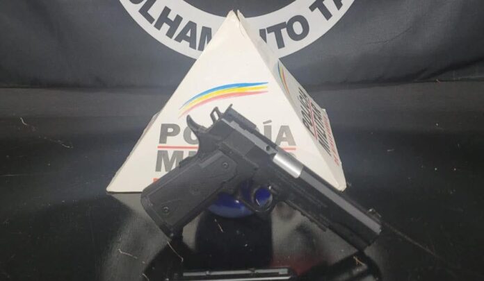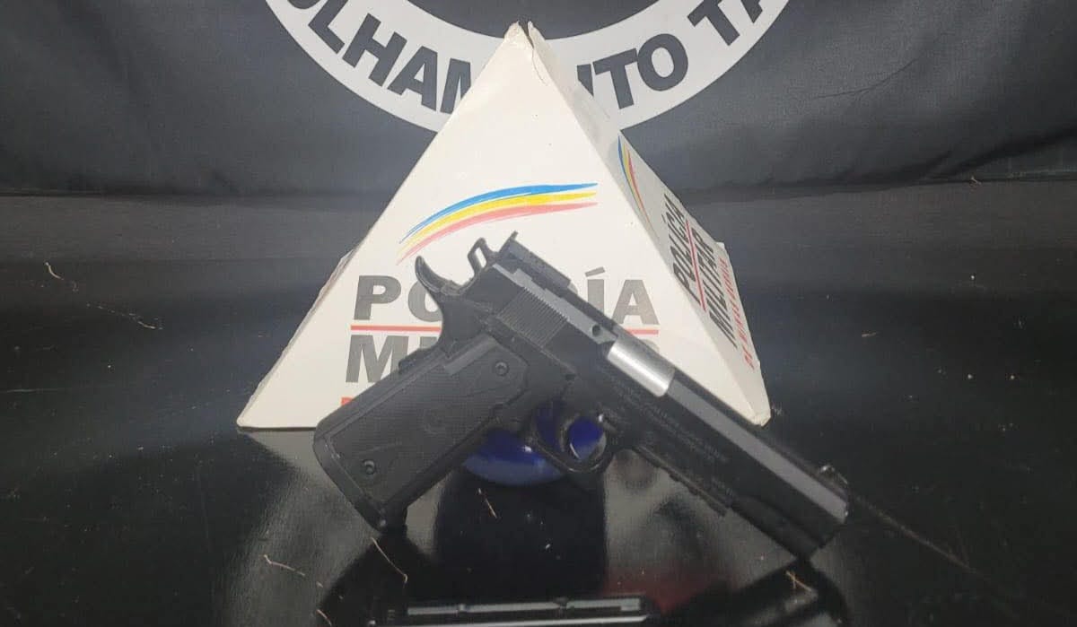 Durante a revista pessoal, os militares encontraram na cintura do indivíduo a arma utilizada no crime: um simulacro de airsoft calibre 6mm. Embora não seja uma arma de fogo letal, o simulacro é capaz de causar lesões dolorosas e foi o instrumento usado para intimidar e ferir a vítima.