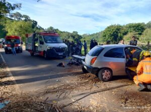 O condutor de um automóvel perdeu o controle da direção e bateu violentamente contra duas árvores às margens da rodovia. Com a força do impacto, o veículo rodou e parou atravessado na pista, obstruindo parcialmente o tráfego em um dos sentidos da via.