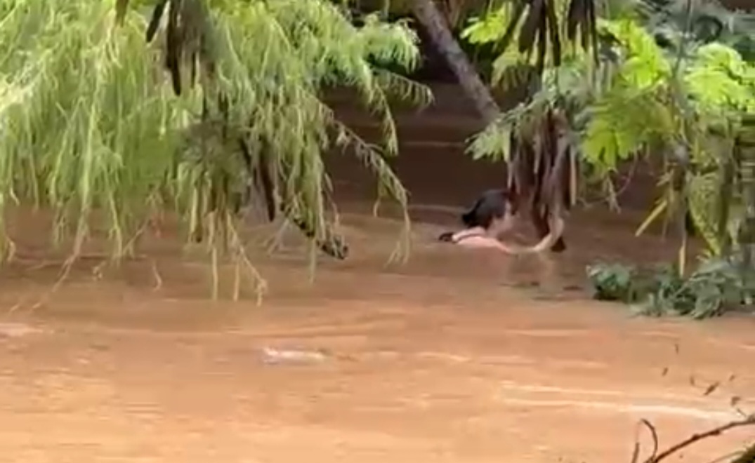 O incidente ocorreu por volta das 13h, mobilizando o centro da cidade. Após cair no leito do rio, a vítima foi arrastada pela correnteza, mas, em um ato de reflexo e sobrevivência, conseguiu se agarrar a galhos de uma árvore próxima às margens. Imagens que circulam nas redes sociais mostram o drama da jovem, imóvel e cercada pela água barrenta, aguardando o socorro.