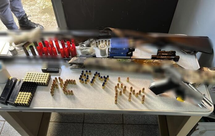 No local, o suspeito foi abordado e, durante a busca domiciliar, foram apreendidos uma pistola marca Taurus calibre 9mm, uma espingarda cartucheira calibre 28, uma carabina de pressão Artemis calibre 5,5mm (.22), 143 munições intactas calibre 9mm, três carregadores de pistola calibre 9mm, oito munições deflagradas calibre .38, uma munição de fuzil calibre 7mm, três munições intactas calibre .22, dez munições deflagradas calibre .22, nove munições deflagradas de espingarda calibre 24, uma munição intacta de espingarda calibre 24, sete munições deflagradas de espingarda calibre 28 e cinco munições deflagradas de espingarda calibre 36.