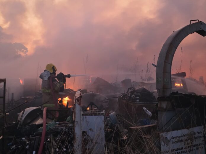 Um incêndio de grandes proporções mobilizou o Corpo de Bombeiros de Guaxupé na tarde desta quinta-feira (14). Por volta das 17h, o 2º Pelotão foi acionado para combater as chamas em um ferro-velho localizado às margens da MG-450, no trecho que liga Guaxupé a Tapiratiba-SP, próximo ao Residencial Bourbon.