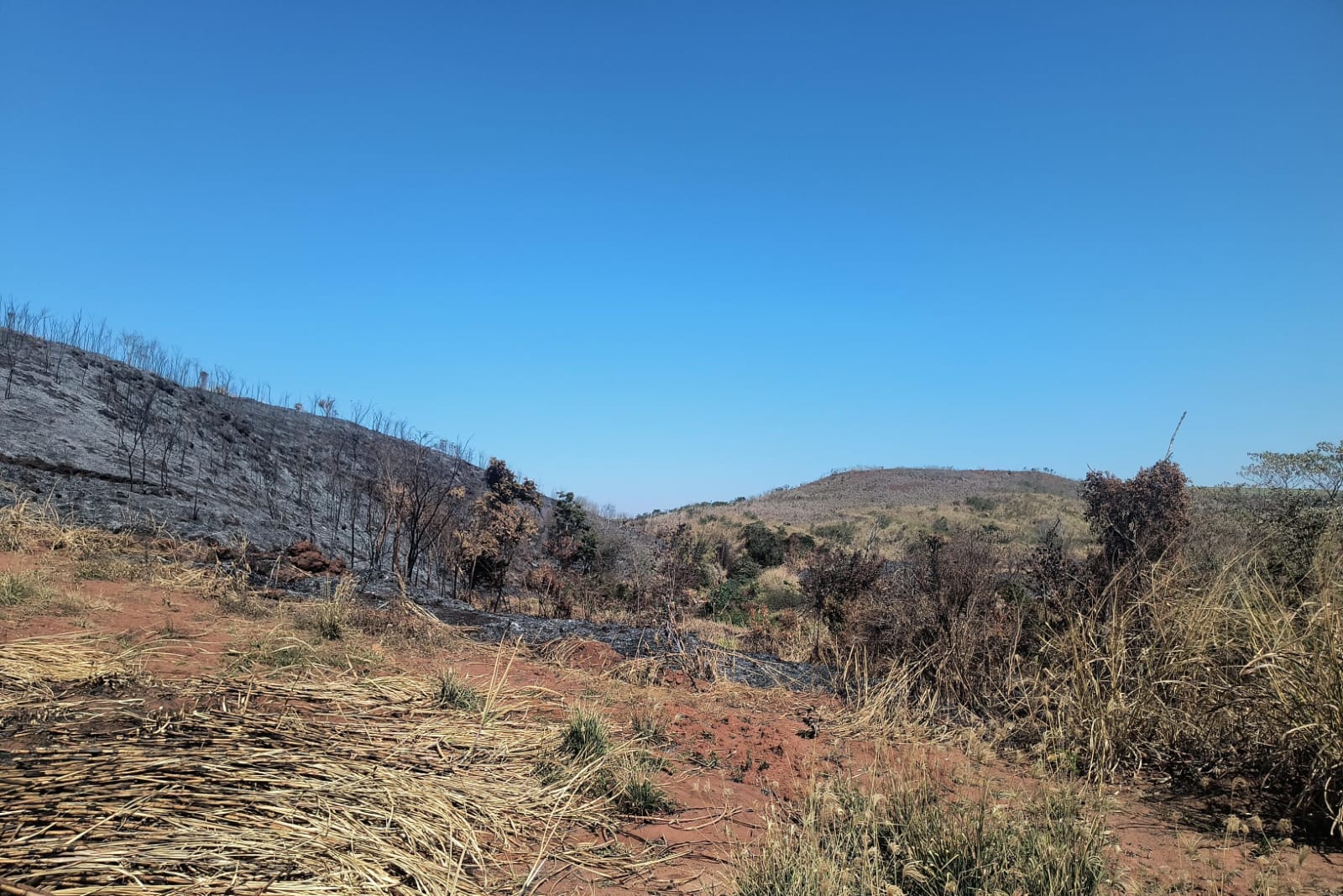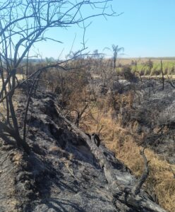 A equipe policial, comandada pelo 1º Tenente PM Shester, foi acionada para atender a um foco de queimada em uma propriedade rural. No local, os agentes constataram que as chamas, originadas em uma área de plantio de cana-de-açúcar, se espalharam e causaram danos significativos à vegetação nativa que faz parte da reserva legal da propriedade.
