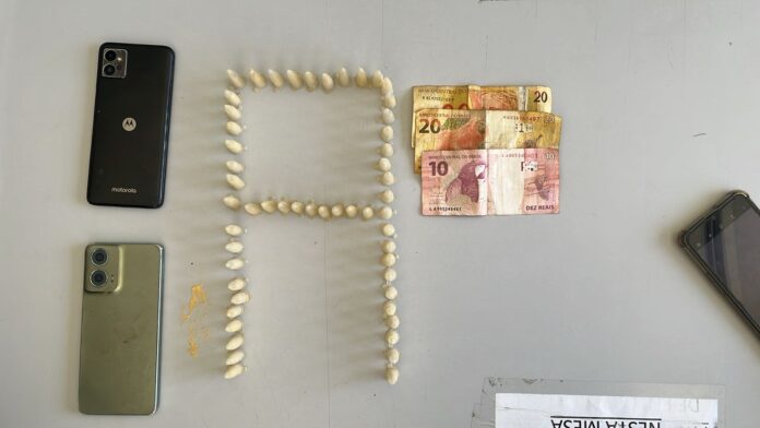 Uma equipe da Polícia Militar composta pelos Cabos Marcos Prado e Braga realizou a prisão em flagrante de dois jovens (18 e 19 anos) e a apreensão de um adolescente (15 anos) por tráfico de drogas, após uma perseguição que terminou em uma propriedade rural no final da manhã desta quarta-feira (06/08). Os suspeitos foram encontrados com 54 pinos de cocaína e R$ 50 em dinheiro.