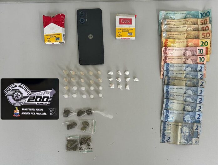 Após ser contida com o uso da força devido à resistência à abordagem, os policiais encontraram as drogas e o dinheiro escondidos. O valor de R$ 306,00 em espécie estava escondido em um absorvente no bolso da bermuda da suspeita.