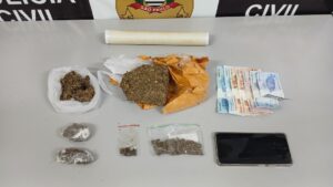 Durante as incursões no primeiro endereço alvo, os policiais localizaram entorpecentes em diferentes cômodos. No quarto do suspeito, foram apreendidos dois saquinhos tipo zip lock com maconha prontos para venda, além de um aparelho celular e R$ 309,00 em notas trocadas — indício claro de comercialização recente.