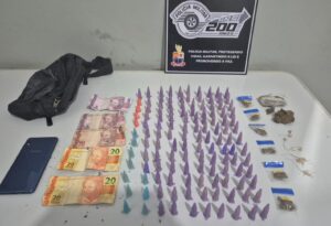 O suspeito foi alcançado e detido na Rua Reinaldo Ferreira. Com ele, os policiais localizaram um saco plástico contendo uma quantidade variada de substâncias ilícitas e dinheiro em espécie.