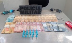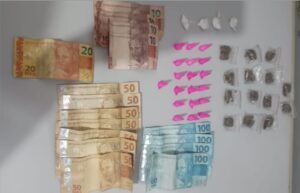 Durante patrulhamento em área conhecida pelo comércio ilícito de entorpecentes, os policiais identificaram a troca de um objeto entre dois indivíduos. Ao se aproximarem para averiguação, um dos suspeitos fugiu, enquanto o outro foi abordado. Em revista pessoal, foram encontradas porções de maconha e cocaína, além de dinheiro e um aparelho celular. O abordado confessou a prática do tráfico.