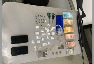 Apreensões: 18 porções de cocaína (0,018 kg), 01 porção a granel de maconha (0,635 kg), 01 porção de LSD (0,016 kg), 01 porção de ecstasy (0,001 kg), 01 porção de MDMA (0,008 kg), 01 carabina de pressão calibre 5,5 mm, 14 munições calibre 32 intactas, 01 estojo calibre 32, 01 balança digital, 02 aparelhos celulares, 03 cartões de banco e R$ 10.497,05 em dinheiro.
