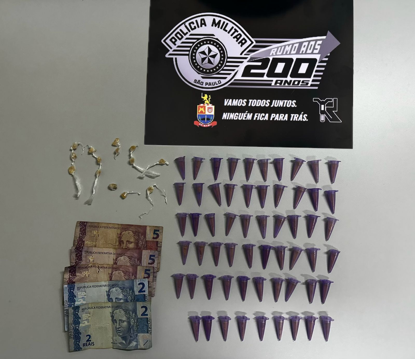 A abordagem e contenção do suspeito exigiram o uso de força e algemas. Em revista pessoal, foram localizadas em suas vestes mais 14 pedras de crack (0,003 kg).