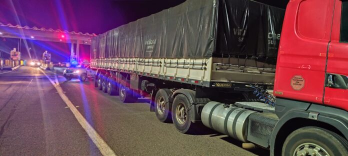 Os policiais abordaram um caminhão-trator Scania, de cor vermelha. Durante a vistoria veicular, foi constatado que a placa dianteira do veículo estava adulterada, exibindo o emplacamento de outro caminhão com características semelhantes.
