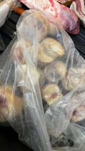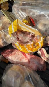 Na ocasião, foram encontradas irregularidades graves, como alimentos com validade expirada desde 2021, carnes armazenadas de forma inadequada, ausência de alvará sanitário e preparo de refeições em local improvisado, anexo a depósito de rações. A ação contou com o apoio da Vigilância Sanitária Municipal e resultou na apreensão de produtos e na lavratura de autos de infração.