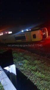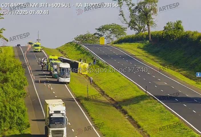 Um grave acidente envolvendo o tombamento de um ônibus deixou 13 pessoas feridas na manhã desta terça-feira (25) no km 372,250 da Rodovia SP-326 (Brigadeiro Faria Lima), no município de Taquaral, interior de São Paulo. O veículo, que fazia a rota de Santos (SP) para Goiânia (GO), levava 38 ocupantes no total.