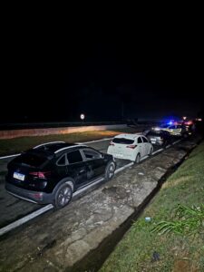 Durante a vistoria dos veículos, os policiais constataram que todos estavam com as placas de identificação adulteradas. O veículo modelo VW/Nivus foi identificado como produto de roubo ocorrido anteriormente.