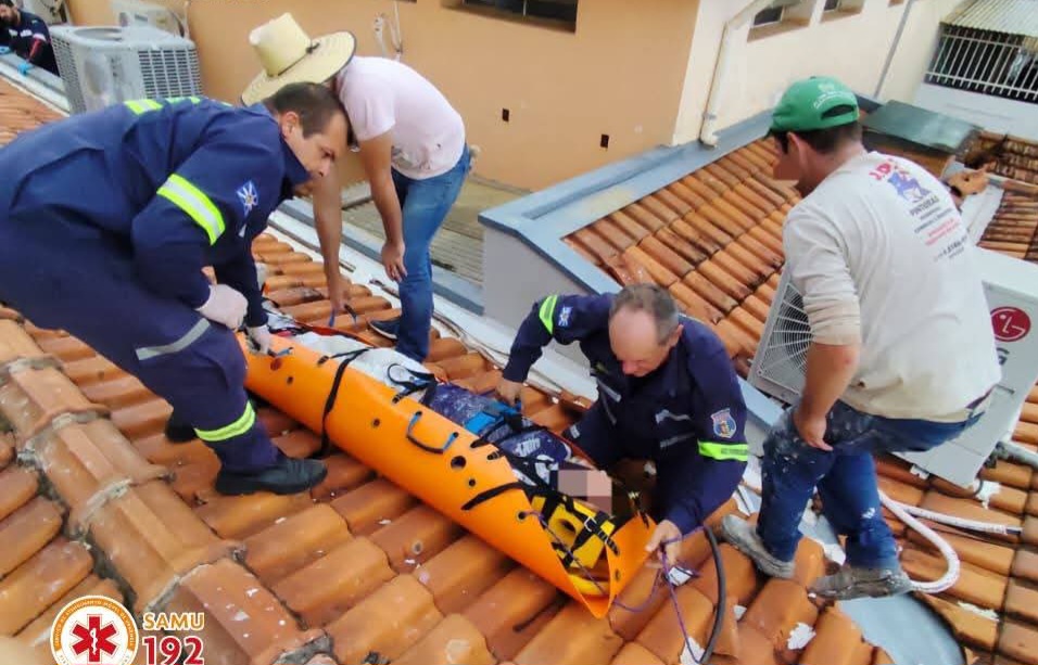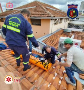 ​Para garantir a preservação da coluna cervical e estabilização do tronco, a vítima foi imobilizada em uma prancha tipo envelope. Devido à inclinação e posição no telhado, o jovem precisou ser içado com o auxílio de um sistema de cordas antes de ser levado à ambulância.
