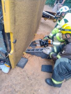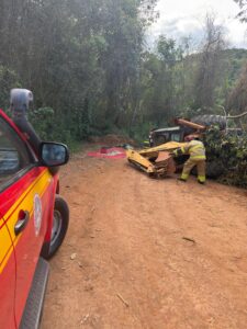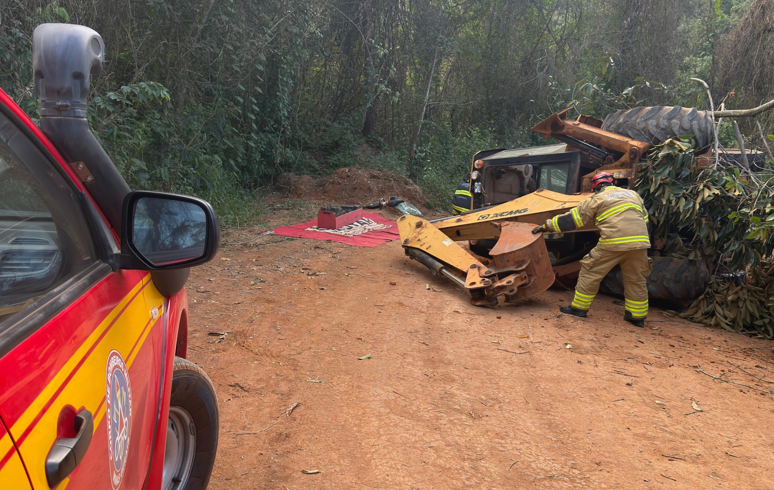 A guarnição dos bombeiros foi acionada para realizar o desencarceramento da vítima, que estava presa sob o peso da estrutura metálica da retroescavadeira. O trabalho foi minucioso para permitir a retirada do corpo com segurança.